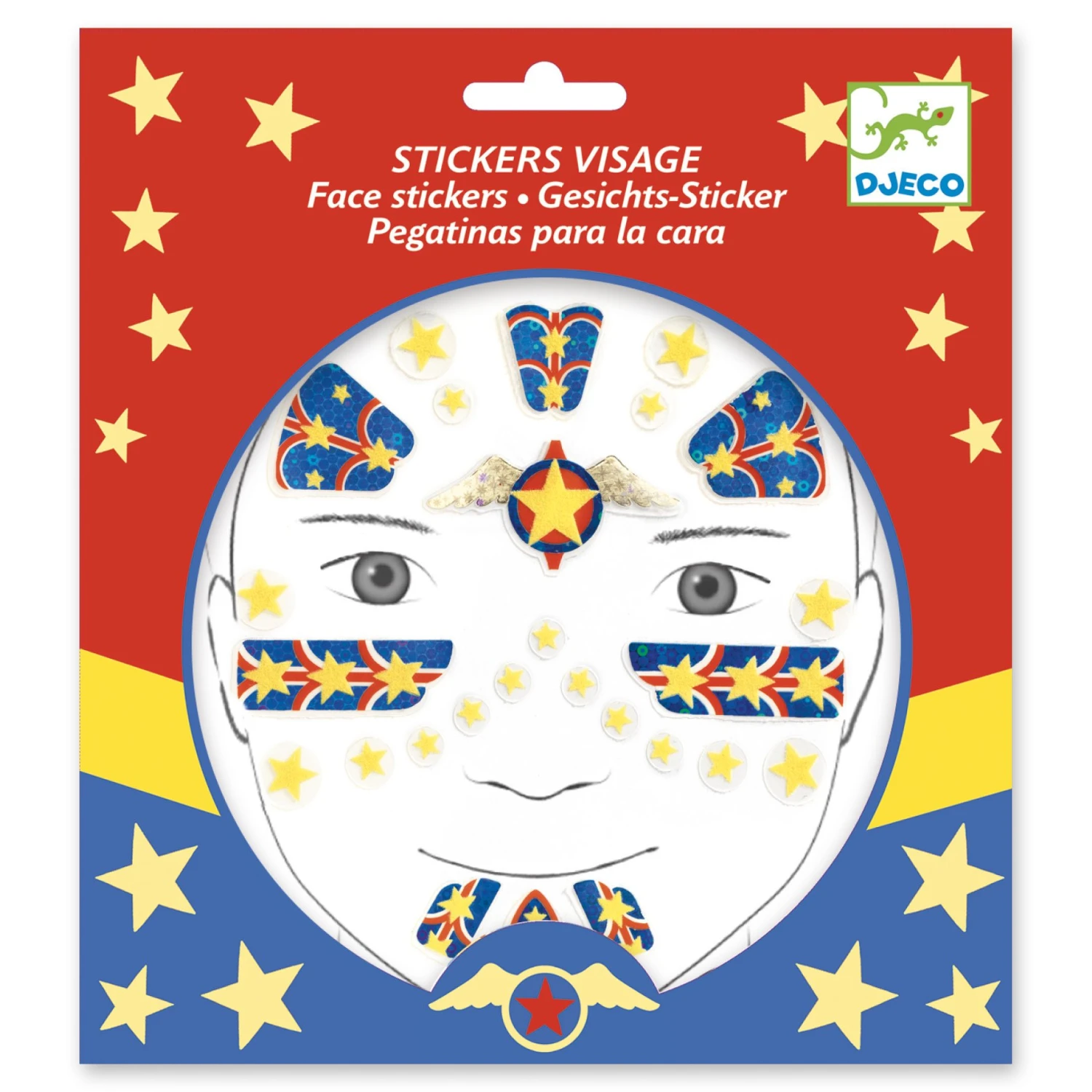 Met Verkleedkleding, Accessoires – Body Art gezichtstickers Superheld (Super Hero) van het merk Djeco tover jij jouw kindje gemakkelijk om in een echt superheld. Gebruik alleen de stickers of combineer met schmink voor een prachtig resultaat.