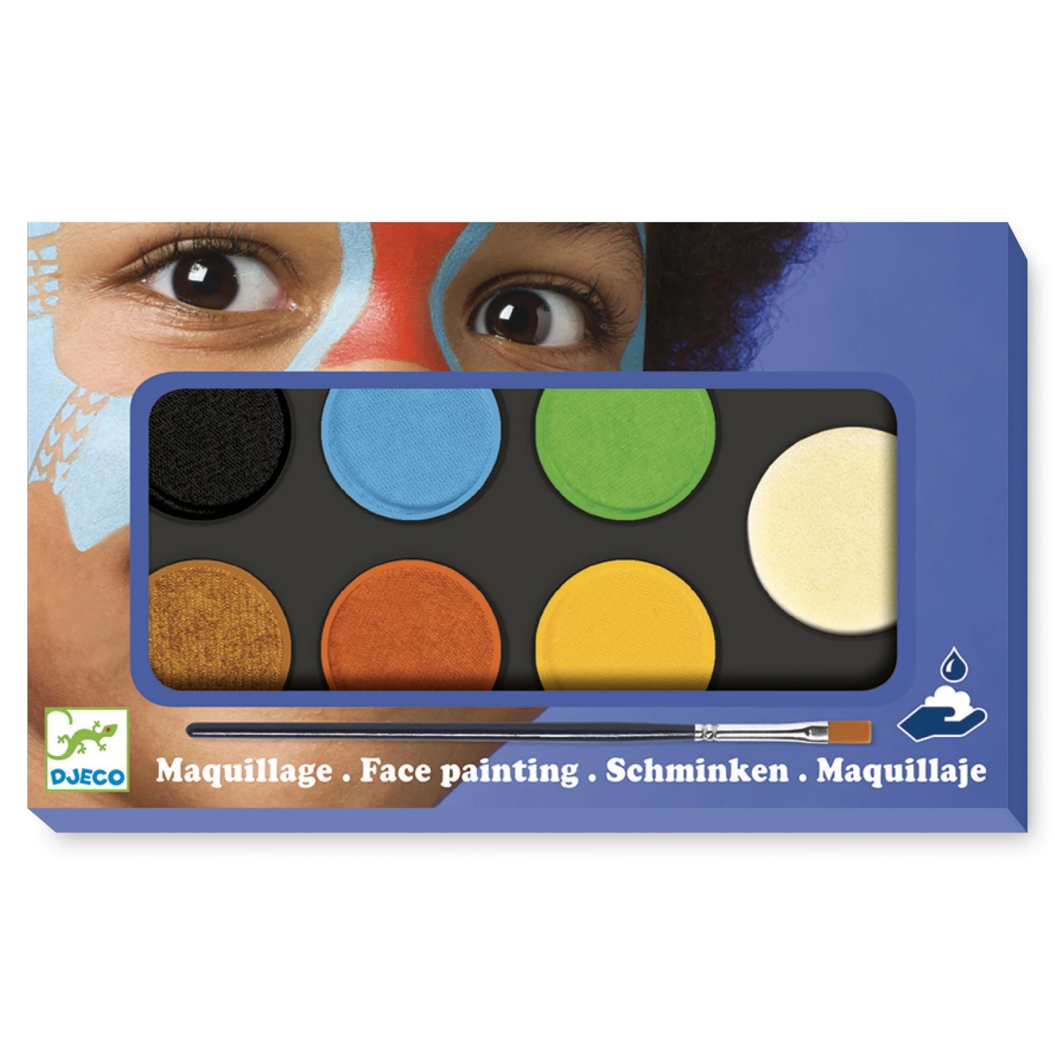 Verkleedkleding, Accessoires – Schmink: body art nature is een schmink palet met 6 kleuren van het merk Djeco. De set bestaat uit: een spons, een penseel en de 6 kleuren; zwart, blauw, groen, bruin, rood en geel.