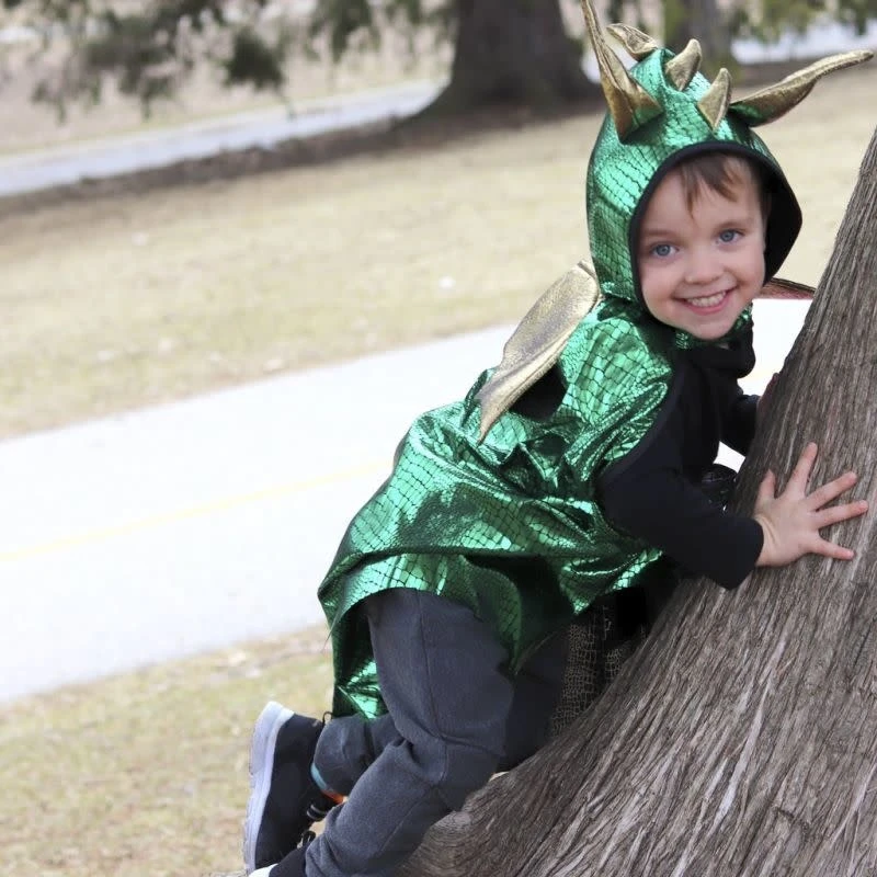 Whraaaaah … Jouw kleintje tovert zichzelf gemakkelijk om tot een stoere draak met deze cape van het merk Great Pretenders. Je trekt de cape gemakkelijk over het hoofd aan. De cape heeft ook een staart en vleugels die je uit kan slaan voor het echte draken gevoel. De gouden hoorns op de kap, maken deze stoere draken cape compleet. US maat 5-6, Nederlandse maat +/- 116-122.