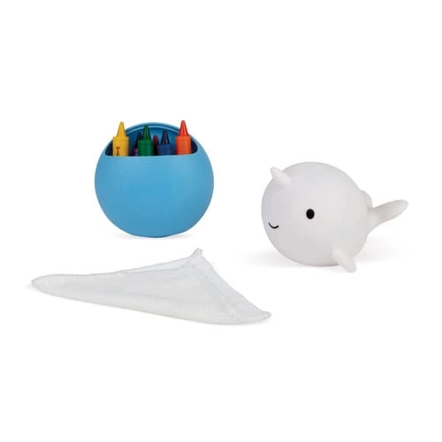 Een narwal om te kleuren, 6 stiften, een stifthouder, een schoonmaakdoek. Maak je stifthouder vast aan de muur van je badkamer met de zuignappen en kleur je narwal telkens opnieuw! Maak hem schoon in je badkuip met behulp van de doek.