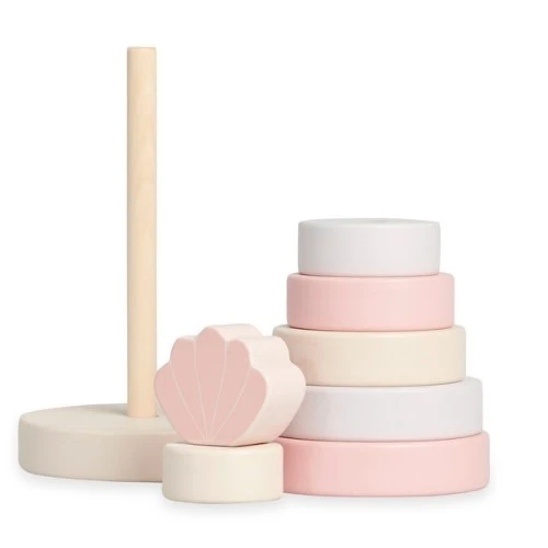 Een mooie roze houten stapeltoren met een schelp bovenop van het merk Jollein. Heerlijk om je kind te laten bouwen.