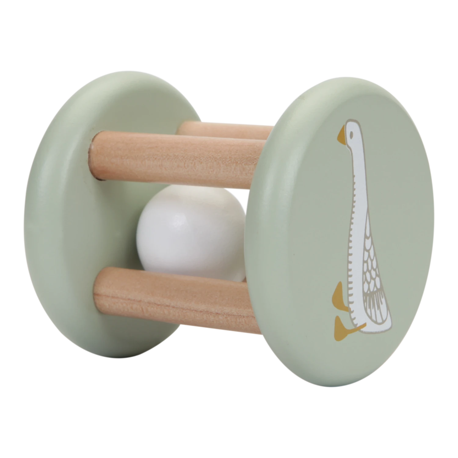 Deze rammelaar kan rollen en het belletje geeft een rinkelend geluidje. Kleintjes vinden het prachtig en kunnen de rammelaar goed vasthouden aan de houten spijlen. De rammelaar is van stevig hout gemaakt en gekleurd met kindvriendelijke verf op waterbasis.