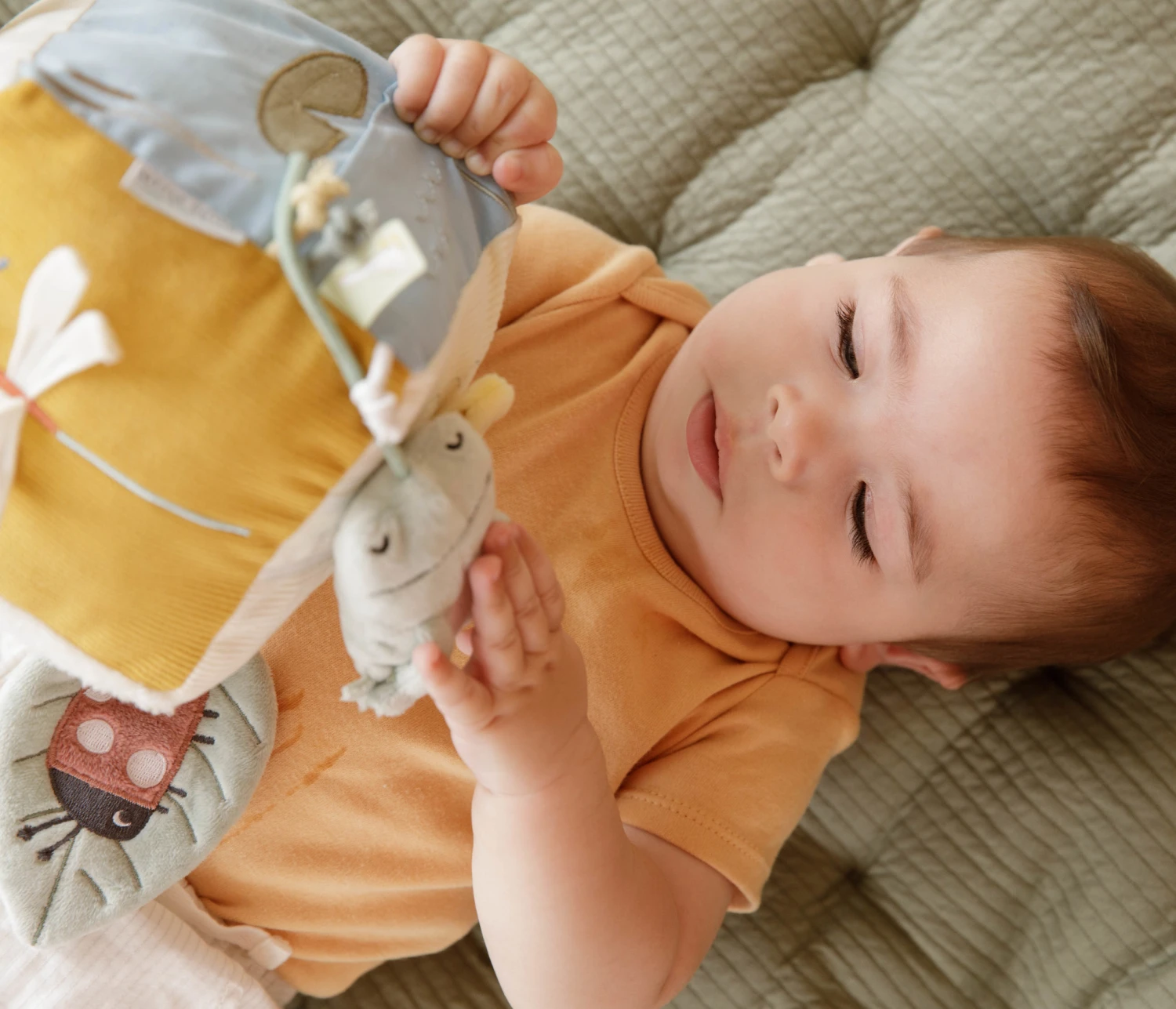 De zachte kubus van Little Goose en zijn vriendjes bevat veel activiteiten die de zintuigen van baby’s prikkelen. Er is zoveel om te ontdekken en mee te spelen: diverse labeltjes, verschillende texturen, een spiegeltje en een rammelaar die bij iedere beweging geluid maken. Ook is er een kleine kikker die graag verstoppertje speelt. Dit speelgoed blijft interessant en zorgt voor veel speelplezier in de box.