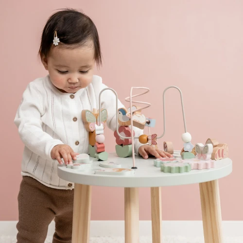 Sta op en speel! Ontdek alle activiteiten die deze tafel te bieden heeft. Help de vlinders om de kralen heen en weer langs de spiraal te brengen. Of bouw een bloementoren. Maak de puzzel, draai aan de tandwielen en beweeg het konijntje, de rups en het lieveheersbeestje door de bloemenweide. Deze houten activiteitentafel daagt je kleintje op vele manieren uit. Er zijn 5 activiteiten om te ontdekken, die elk de ontwikkeling van fijne motoriek ondersteunen. Dankzij het veilige en uitgebalanceerde ontwerp stimuleert de activiteitentafel ook het opstaan. Én het blijven staan! Want al die speelfuncties zullen je peuter een tijdje bezig houden.