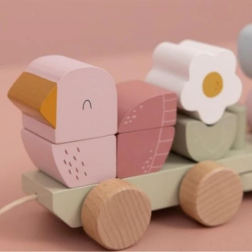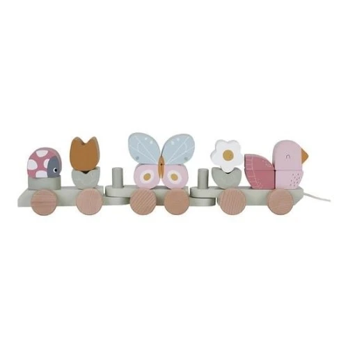 Laten we met de trein wegvliegen! Deze houten trein is klaar voor een nieuw avontuur in de bloeiende tuin. Het roze vogeltje Olivia laat je de mooiste bloemen en vlinders zien. Gebruik je fantasie om de trein te bouwen met behulp van de stapelblokken in verschillende vormen en dromerige kleuren. Er zijn drie wagons om te stapelen met een vogel, bloemen, vlinder en lieveheersbeestje. Daag je kleintje uit om verschillende combinaties te maken om de hand-oog coördinatie en fijne motoriek te ondersteunen. Het is ook een leuk accessoire voor de kinderkamer of speelkamer.