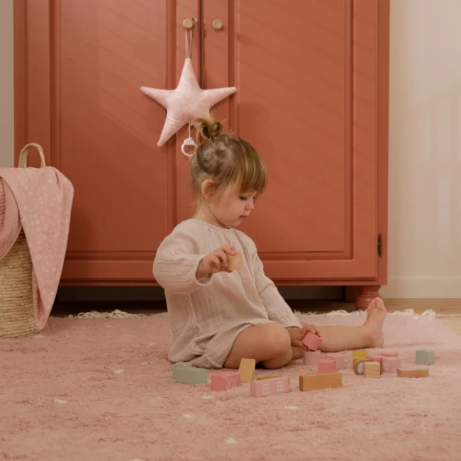Houten blokken in een handige opbergton van het merk Little Dutch. Deze blokken in het thema wild flowers, hebben de nieuwe roze kleuren van Little Dutch.