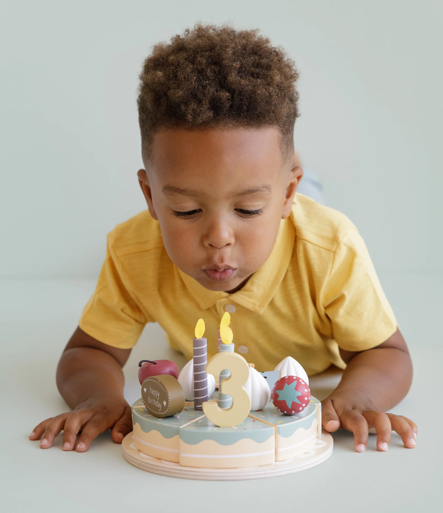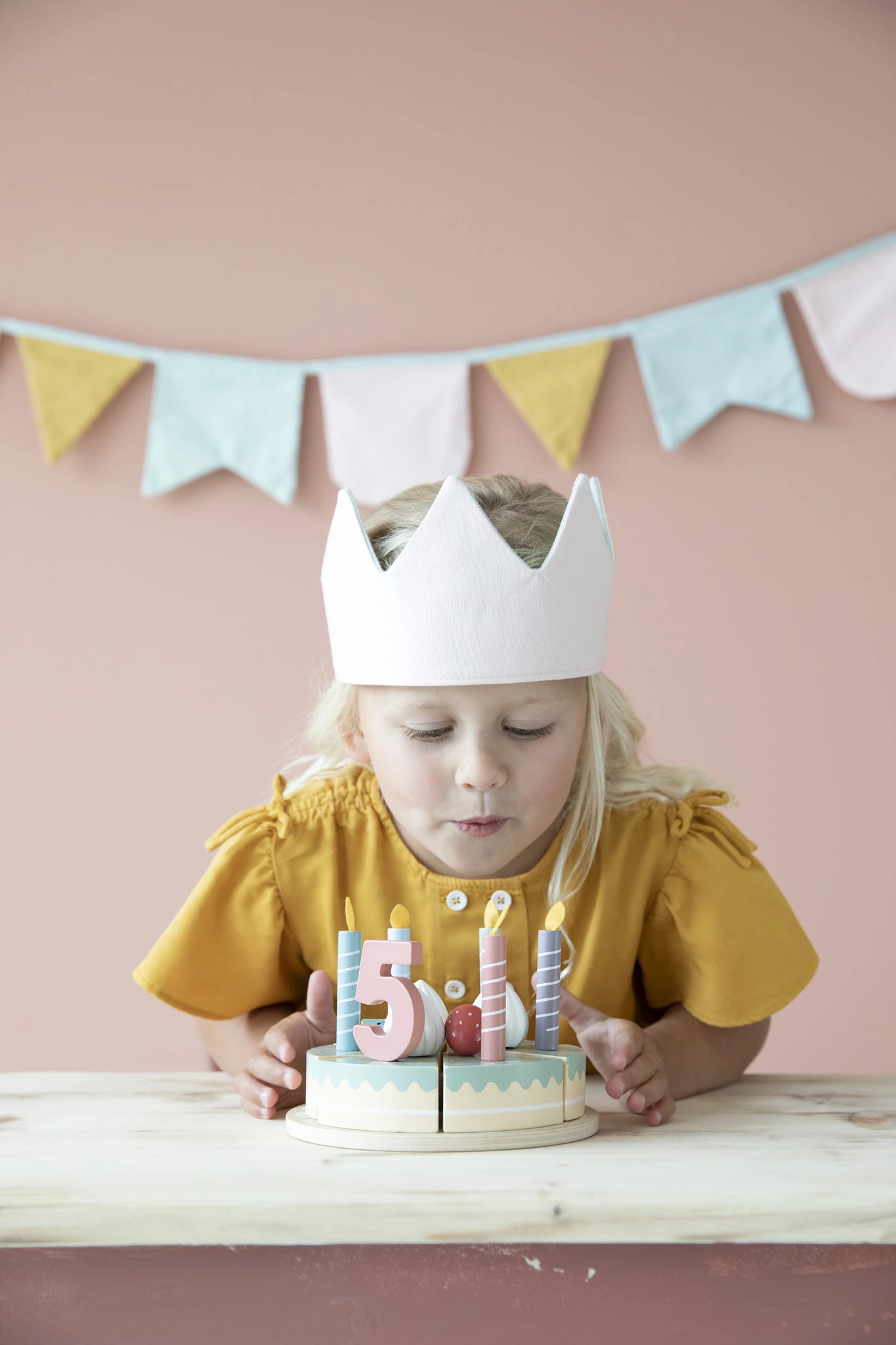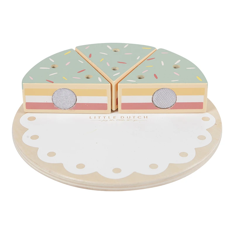 De set bestaat uit 6 stukjes taart op een plateau, een taartschep, kaarsen, slagroomtoefjes en cijfertoppers. Geverfd met kindvriendelijke verf op waterbasis.