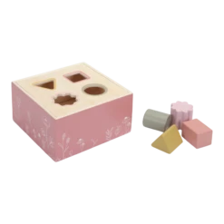 Vrolijke houten vormenstoof van Little Dutch met illustraties van bloemen. De kubus heeft 4 verschillende openingen waar vormen naar binnen worden geduwd. Deze vormenstoof stimuleert de oog-handcoördinatie en leert je kindje vormen herkennen.
