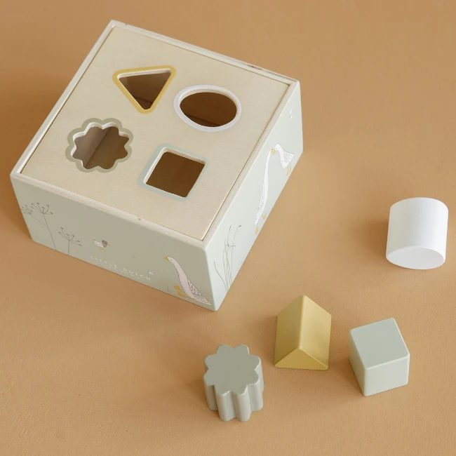 Houten speelgoed – houten vormenstoof gans (Little Goose) is een kleine vierkante vormenstoof is zacht groene kleuren uit de Little Goose collectie van Little Dutch. Bevat 4 vormen die je vanaf bovenin kan plaatsen.
