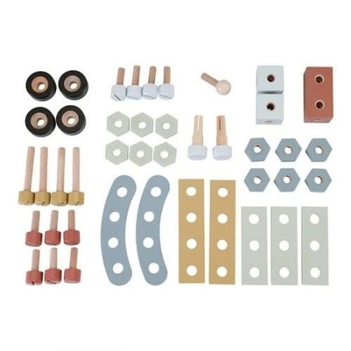 Laten we het maken! Wat je ook bedenkt, met deze werkbank kun je alles bouwen. Pak je gereedschap en begin met klussen. Creëer een auto, een motor of maak een eigen creatie door de losse onderdelen aan elkaar te verbinden. Peuters kopiëren maar al te graag hun ouders. Met deze werkbank kunnen ze heerlijk timmeren, schroeven en repareren, net als volwassenen! Ze zullen uren zoet zijn met het maken van een creatie om het vervolgens weer uit elkaar te halen en opnieuw te beginnen. De werkbank stimuleert rollenspel, creativiteit, motorische vaardigheden en verbeeldingskracht. De werkbank heeft een opbergrek met 4 tandwielen, een krijtbord voor de to-do lijst, twee opbergvakjes en een bankschroef. De set bestaat daarnaast uit 55 onderdelen zoals bouten en moeren, schroeven, panelen en wielen. Maar natuurlijk ook essentiële gereedschappen zoals een hamer, zaag, schroevendraaier, waterpas, duimstok en bankschroef. De stoere houten werkbank in moderne kleuren creëert een mooie speelruimte in een kinderkamer maar staat ook prachtig in de woonkamer. Combineer met de gereedschapskist voor nog meer speelplezier.
