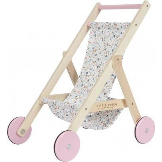 Neem jouw pop mee voor een wandeling met deze fleurige houten poppen buggy van het merk Little Dutch.