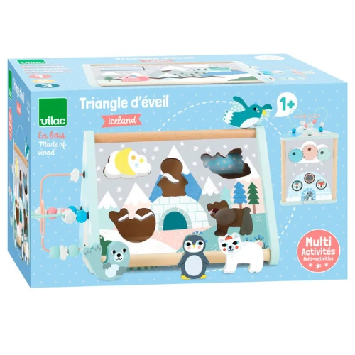 Mooie houten activiteiten driehoek van het merk Vilac in het thema: noordpool. Bevat verschillende elementen voor jongen kinderen om te ontdekken: vormenstoof, kralenframe, draaischijven etc.