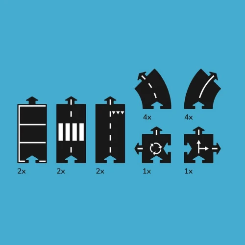 Deze snelweg set bestaat uit: 8 bochten, 6 rechte baandelen, 1 kruising en 1 rotonde.