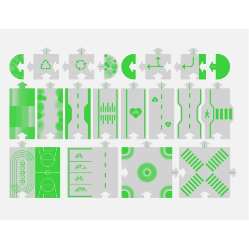 Deze kartonnen set bestaat uit: 8 rechte delen, 4 grote vierkanten, 4 T-kruisingen en 4 halve cirkelvormige weguiteinden/doodlopende wegen.